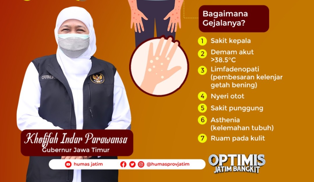 Khofifah menerangkan bahwa virus Monkeypox ditularkan melalui kontak erat manusia dengan manusia. Gejalanya antara lain adalah demam, sakit kepala, ruam pada kulit, nyeri otot dan kelelahan.