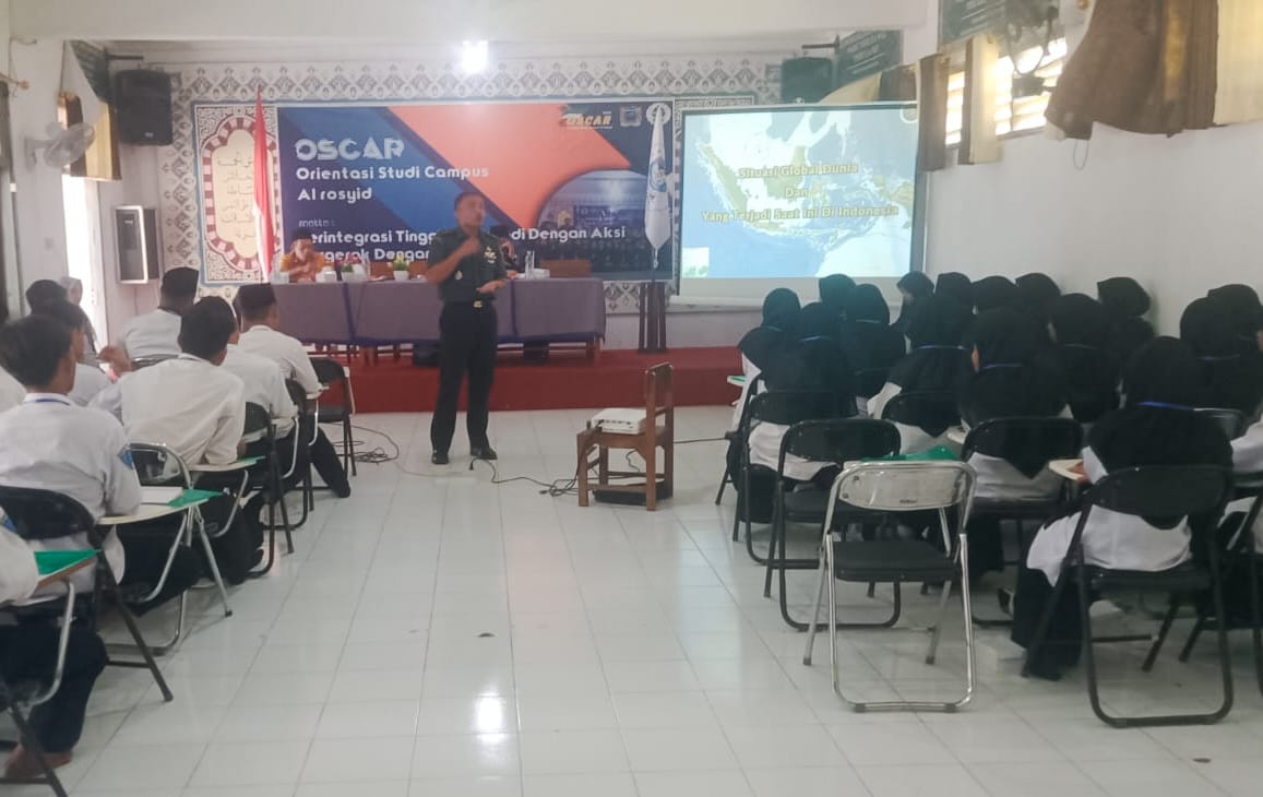 Kepala Staf Komando Distrik Militer (Kasdim) 0813 Bojonegoro, Mayor Inf I Putu Gede Widarta, membekali Wawasan Kebangsaan (Wasbang) terhadap mahasiswa baru Sekolah Tinggi Ekonomi dan Bisnis Islam Al Rosyid (STEBIA) tahun akademik 2022/2023.