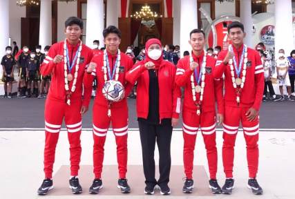 SURABAYATODAY.ID, SURABAYA – Usai juara di ajang Piala AFF U-16 pada 12 Agustus 2022 lalu, Gubernur Jawa Timur Khofifah Indar Parawansa mengundang pemain Timnas Indonesia U-16 asal Jatim ke Gedung Negara Grahadi, Sabtu (27/8) petang.