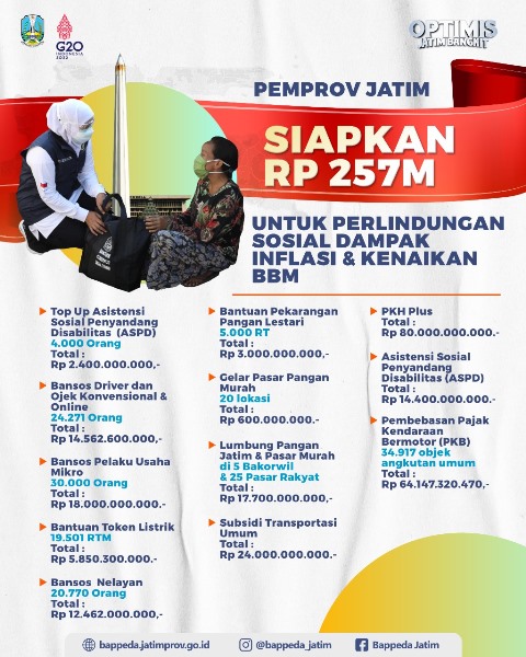 SURABAYATODAY.ID, SURABAYA – Program perlindungan sosial penanganan dampak inflasi dan kenaikan Bahan Bakar Minyak (BBM) dilincurkan di Jatim. Program ini dihadirkan untuk meringankan beban dan membantu masyarakat yang terdampak kenaikan harga BBM.
