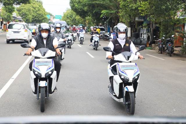 Gubernur Jawa Timur Khofifah Indar Parawansa dalam suatu kesempatan mencoba motor listrik.