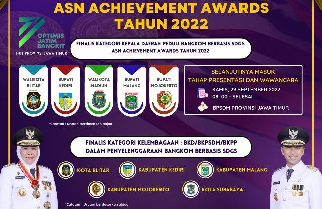 Lima kepala daerah finalis ASN Achievement Award Tahun 2022 tersebut adalah Wali Kota Blitar Santoso, Bupati Kediri Hanindhito Himawan Pramana, Wali Kota Madiun Maidi, Bupati Malang Sanusi, dan Bupati Mojokerto Ikfina Fahmawati.