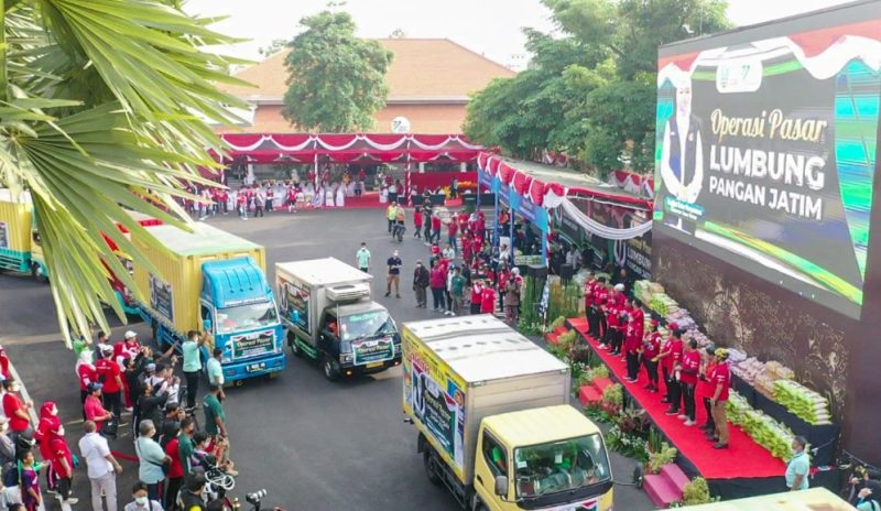 Diberangkatkan dari Gedung Negara Grahadi, puluhan truk tersebut menuju 25 pasar yang tersebar di 8 Kabupaten/Kota di Jawa Timur.