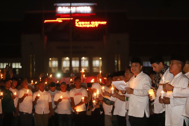 Setelah menggelar doa bersama, Wali Kota Eri Cahyadi dan Wakil Wali Kota Armuji serta para tamu undangan yang hadir menyalakan lilin dan menaruh rangkaian bunga sebagai simbol berkabung, perdamaian serta persaudaraan, di dekat air mancur Taman Surya.