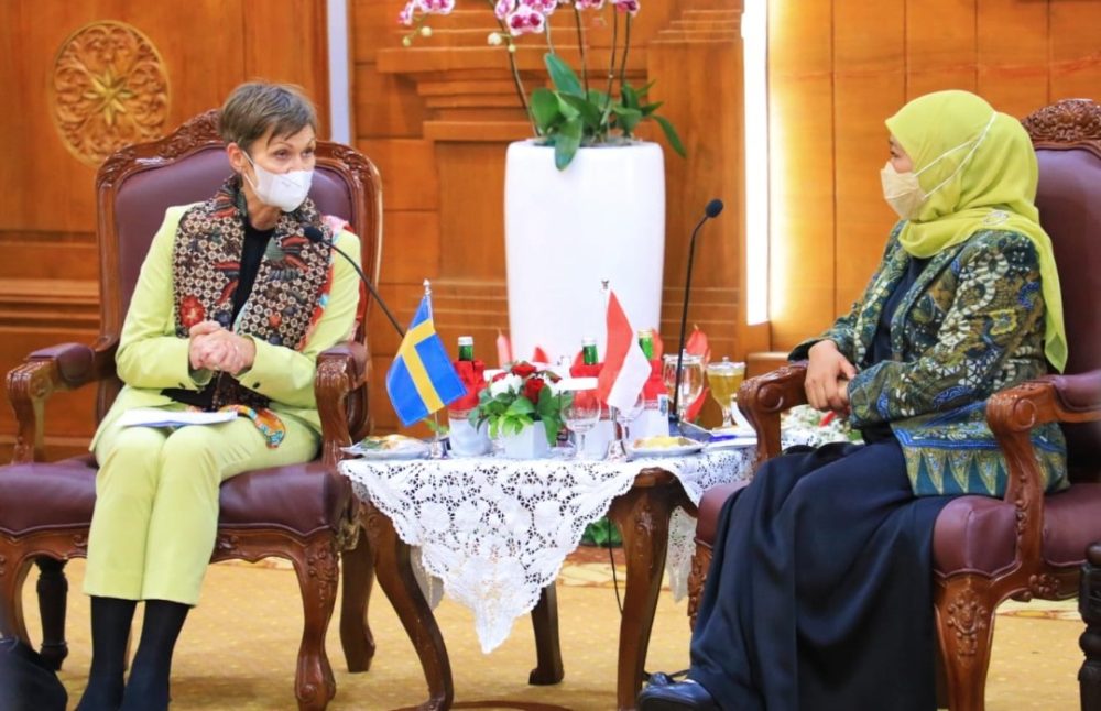 Gubernur Jawa Timur Khofifah Indar Parawansa dan Duta Besar (Dubes) Swedia untuk Indonesia, Marina Berg, di Gedung Negara Grahadi Surabaya.