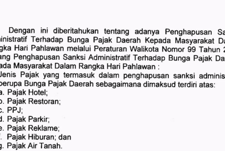 Sementara itu Wali Kota Surabaya Eri Cahyadi mengatakan, penghapusan sanksi pajak bunga daerah itu rutin dilakukan pemkot, sesuai dengan Peraturan Wali Kota (Perwali) Nomor 99 Tahun 2022 tentang Penghapusan Sanksi Administratif Terhadap Bunga Pajak Daerah Kepada Masyarakat Dalam Rangka Hari Pahlawan.