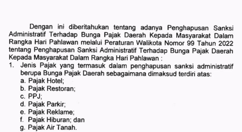 Sementara itu Wali Kota Surabaya Eri Cahyadi mengatakan, penghapusan sanksi pajak bunga daerah itu rutin dilakukan pemkot, sesuai dengan Peraturan Wali Kota (Perwali) Nomor 99 Tahun 2022 tentang Penghapusan Sanksi Administratif Terhadap Bunga Pajak Daerah Kepada Masyarakat Dalam Rangka Hari Pahlawan.