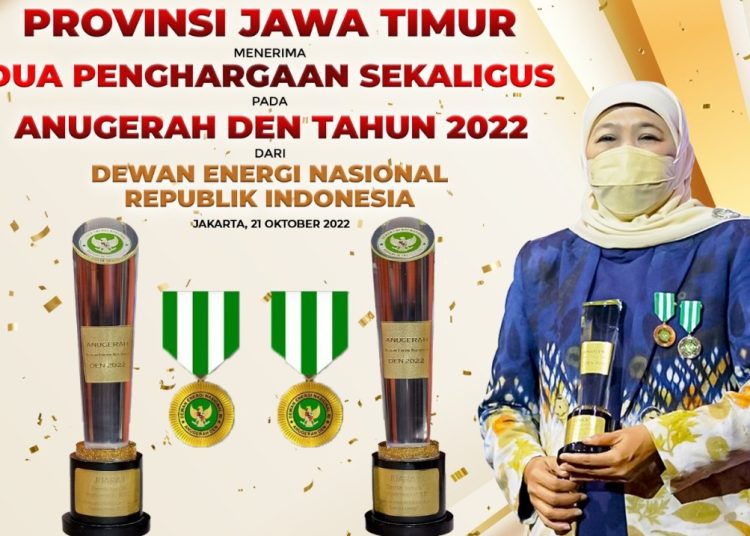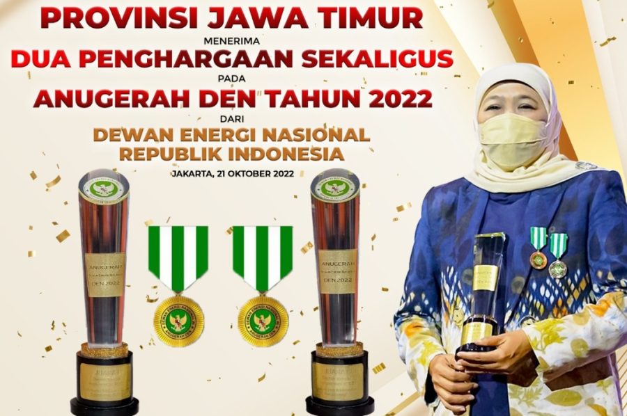 Penghargaan tersebut diterima Gubernur Jawa Timur Khofifah Indar Parawansa saat Resepsi Anugerah Dewan Energi Nasional Tahun 2022 di Auditorium Binakarna Hotel Bidakara Jakarta, Jumat (21/10) malam lalu.