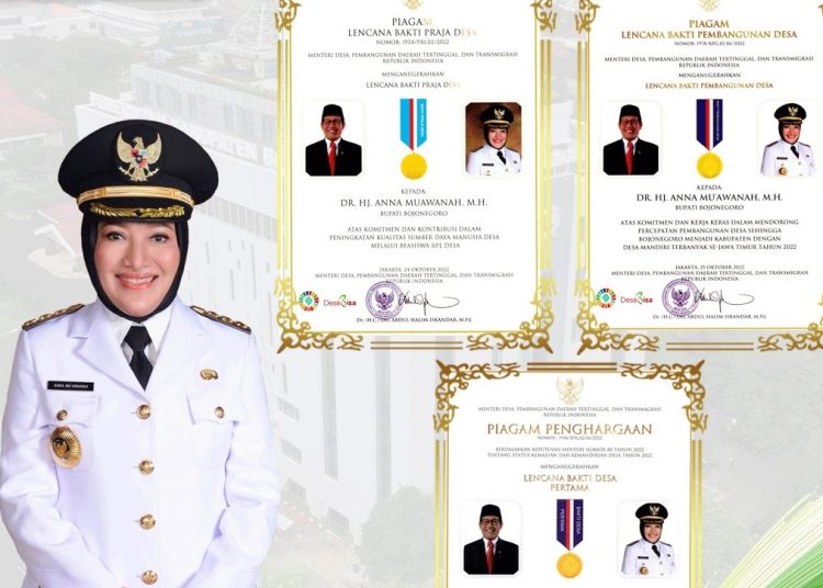 SURABAYATODAY.ID, BOJONEGORO – Bupati Bojonegoro Anna Mu’awanah mendapatkan tiga penghargaan sekaligus dari Menteri Desa, Pembangunan Daerah Tertinggal dan Transmigrasi Abdul Halim Iskandar,