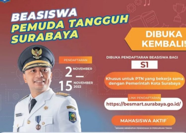 SURABAYATODAY.ID, SURABAYA – Pemkot Surabaya kembali membuka pendaftaran Beasiswa Pemuda Tangguh Surabaya. Kali ini, beasiswa itu khusus mahasiswa aktif S1 atau yang sedang menempuh pendidikan perguruan tinggi. Pendaftaran beasiswa itu dibuka mulai tanggal 2-15 November 2022 melalui website https://besmart.surabaya.go.id/.