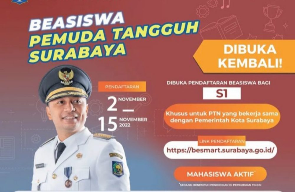 SURABAYATODAY.ID, SURABAYA – Pemkot Surabaya kembali membuka pendaftaran Beasiswa Pemuda Tangguh Surabaya. Kali ini, beasiswa itu khusus mahasiswa aktif S1 atau yang sedang menempuh pendidikan perguruan tinggi. Pendaftaran beasiswa itu dibuka mulai tanggal 2-15 November 2022 melalui website https://besmart.surabaya.go.id/.