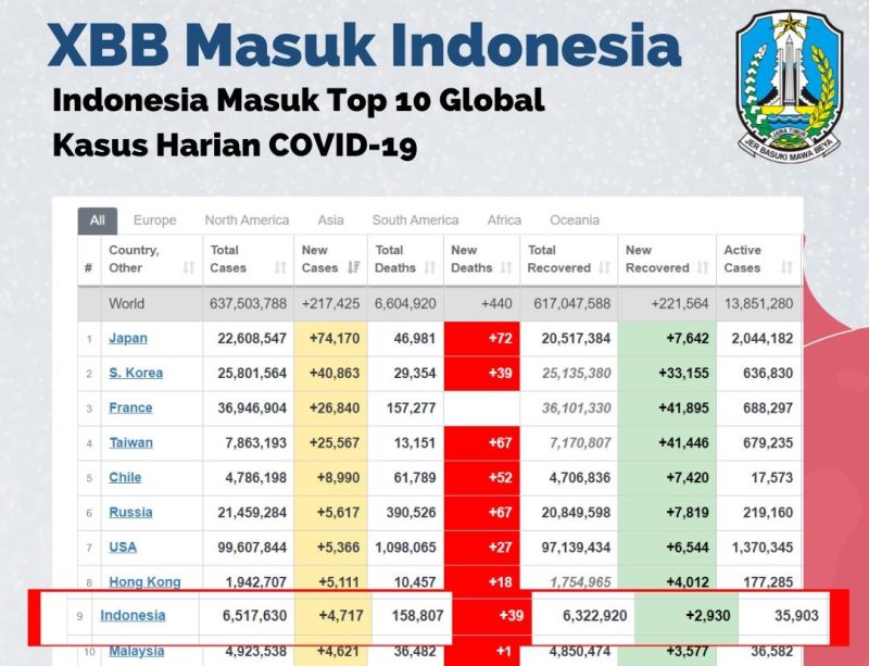 Tak hanya di Jatim, peningkatan kasus Vovid-19 juga mengalami peningkatan secara nasional. Bahkan Indonesia masuk sepuluh besar peningkatan secara global dengan tambahan 4.707 kasus secara nasional dalam sehari.