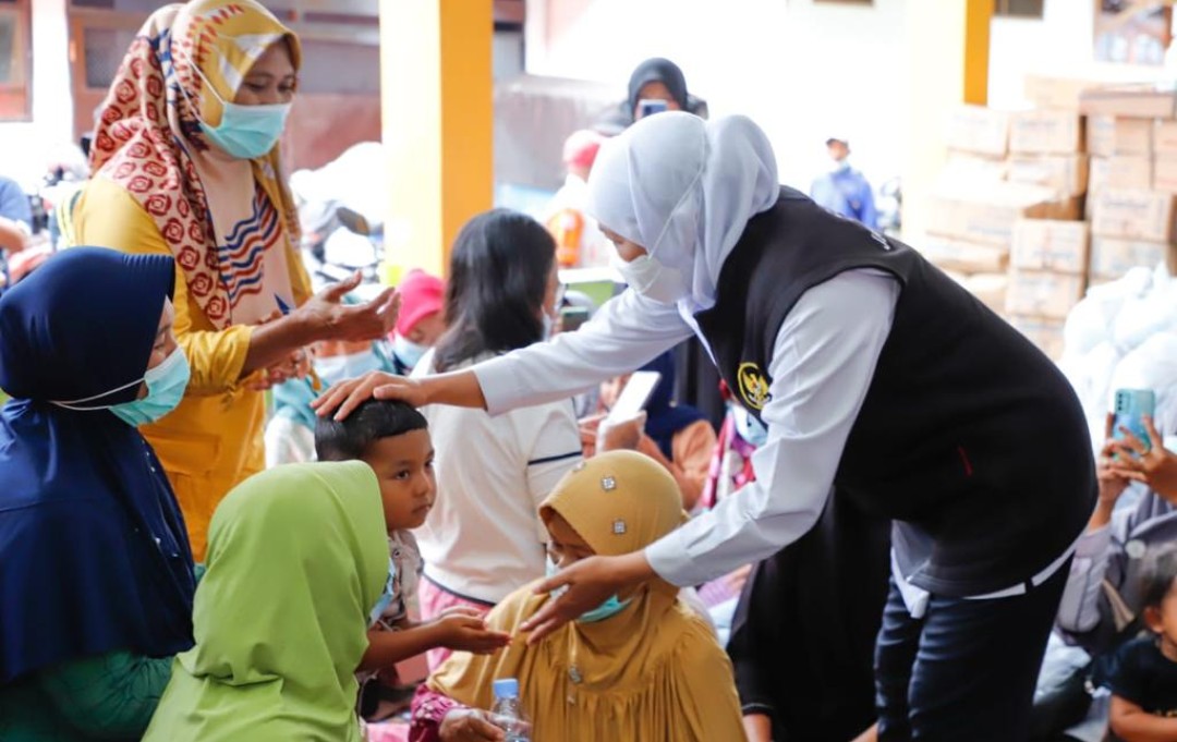 Di kantor Desa Kalibaru Wetan, Kecamatan Kalibaru, Khofifah didampingi Wakil Bupati Banyuwangi Sugirah menyerahkan langsung bantuan kepada warga terdampak banjir di posko tanggap darurat (posko bantuan dan dapur umum), Rabu (9/11).