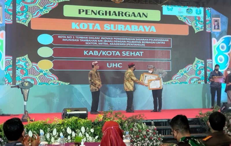 Pada kesempatan tersebut, Pemkot Surabaya berhasil memboyong 3 kategori dalam upaya penanganan kesehatan di Provinsi Jatim. Di antaranya, Kota Nomor satu terrbaik dalam Inovasi Pergerakan Masyarakat Sasaran Pelaksanaan Imunisasi Tambahan MR (BIAN) dengan Pelibatan Berbagai Lintas Sektor, Mitra, Akademisi (Pentahelix). Serta, Kabupaten/Kota Sehat dan Universal Health Coverage (UHC).