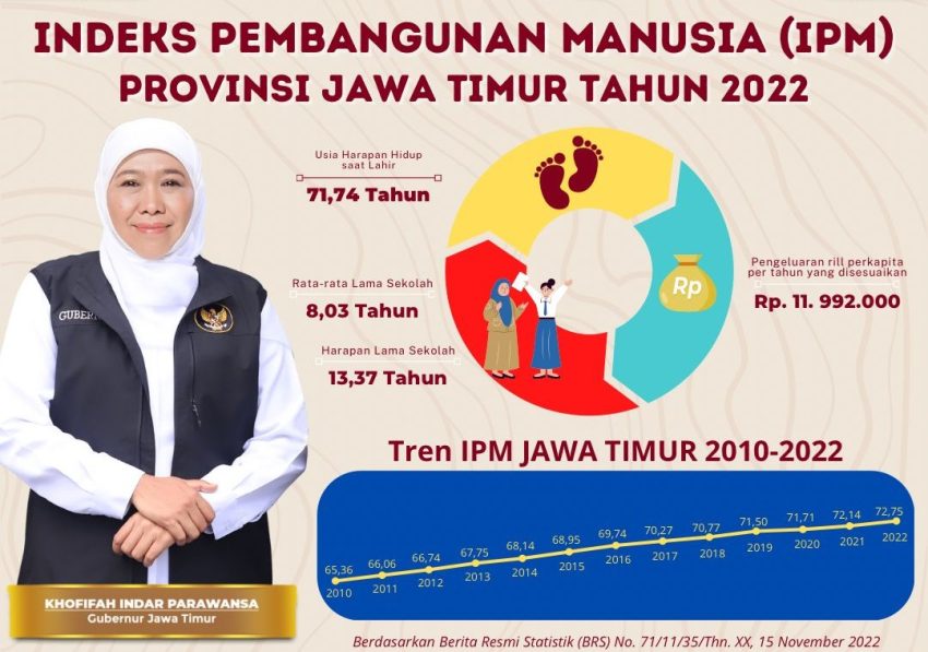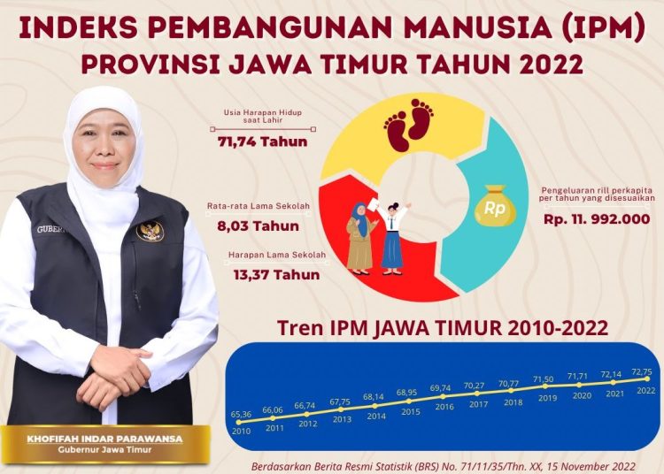 Berdasarkan catatan dari Badan Pusat Statistik (BPS), IPM Jatim Tahun 2022 sebesar 72,75 atau mengalami kenaikan 0,61 poin (0,85 persen) dari tahun sebelumnya.