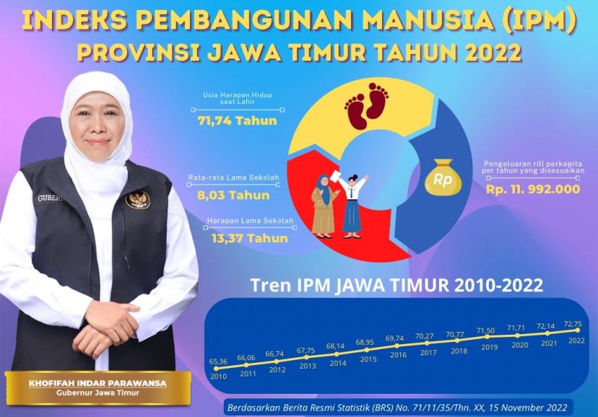 SURABAYATODAY.ID, SURABAYA – Berdasarkan catatan dari Badan Pusat Statistik (BPS), IPM Jatim Tahun 2022 sebesar 72,75 atau mengalami kenaikan 0,61 poin (0,85 persen) dari tahun sebelumnya. IPM merupakan indikator penting untuk mengukur keberhasilan dalam upaya membangun kualitas hidup manusia (masyarakat/penduduk).