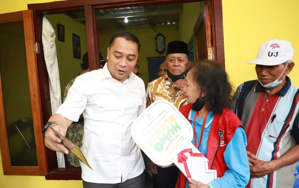 Wali Kota Surabaya Eri Cahyadi menyerahkan 8 kunci rumah hasil dari program rumah tidak layak huni (Rutilahu) Dandan Omah kepada salah satu warga.