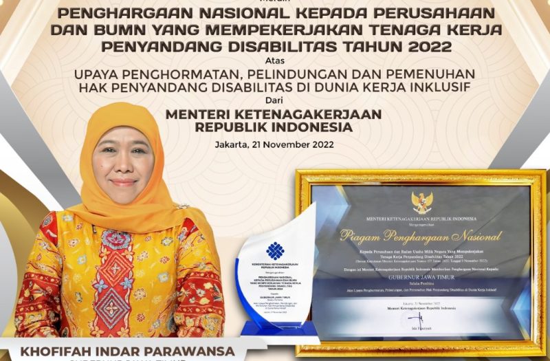 SURABAYATODAY.OD, JAKARTA – Semangat Provinsi Jawa Timur memberikan ruang dan hak yang sama bagi penyandang disabilitas di dunia kerja mendapatkan apresiasi nasional. Hari ini, Senin (21/11), Kementerian Ketenagakeraan RI memberikan penghargaan nasional pada Gubernur Jawa Timur Khofifah Indar Parawansa atas kiprahnya memberikan penghormatan, perlindungan dan pemenuhan hak penyandang disabilitas di dunia kerja inklusif di Jawa Timur.