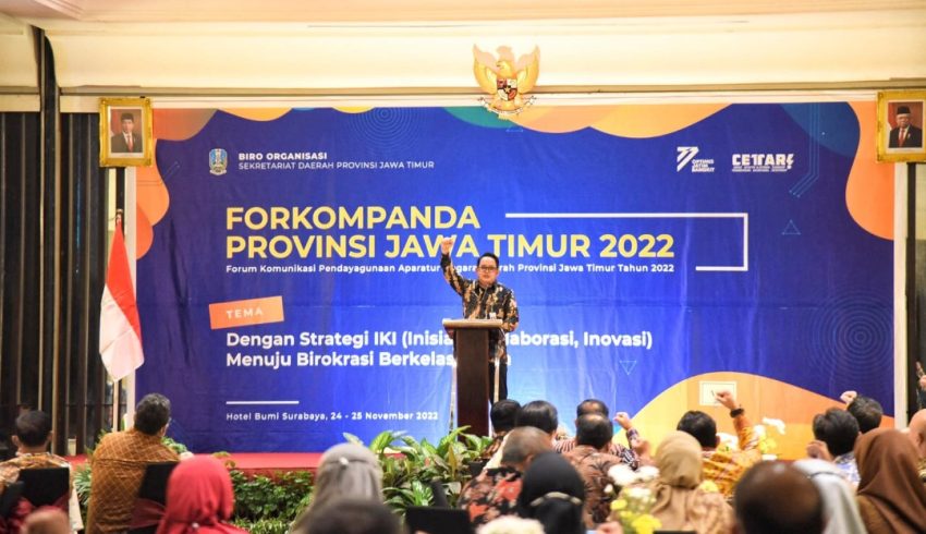 SURABAYATODAY.ID, SURABAYA – Sekretaris Daerah (Sekda) Jawa Timur Adhy Karyono membuka kegiatan Forum Komunikasi Pendayagunaan Aparatur Negara Daerah (Forkompanda) Provinsi Jawa Timur 2022, yang diselenggarakan di Hotel Bumi Surabaya, Kamis (24/11). Forkompanda ini mengambil tema ‘Dengan Strategi IkI (Inisiatif, Kolaboratif, Inovasi) Menuju Inovasi Berkelas Dunia’.