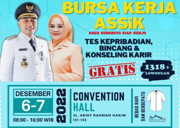 SURABAYATODAY.ID, SURABAYA – Pemkot Surabaya bekerjasama dengan Dharma Wanita Persatuan Kota Surabaya, UHW Perbanas, Apsilangga dan 46 perusahaan menggelar job fair atau bursa kerja Assik (Arek Suroboyo Siap Kerja) di Convention Hall Jalan Arif Rahman Hakim 131-133 Surabaya, Selasa-Rabu (6-7/12).