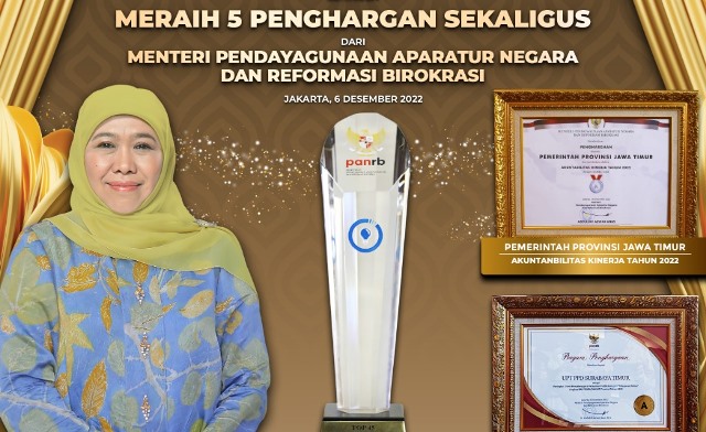 SURABAYATODAY.ID, SURABAYA – Pemerintah Provinsi Jawa Timur menerima lima penghargaan sekaligus dari Kementerian Pendayagunaan Aparatur Negara Reformasi Birokrasi (KemenPan-RB).