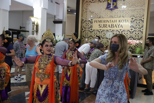 Para wisatawan mancanegara kapal pesiar Viking Mars bmenari bersama dalam tarian kreasi Lenggak-Lenggok di lobby Balai Kota Surabaya.