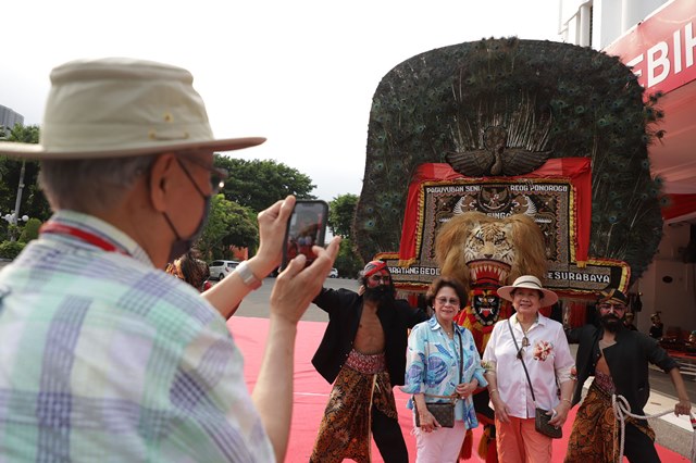 Setibanya di halaman Balai Kota Surabaya, rombongan wisatawan disambut dengan penampilan atraksi reog. Melihat atraksi ini, para wisatawan semakin terpesona. Mereka menyalakan kamera dan merekam atraksi tersebut.