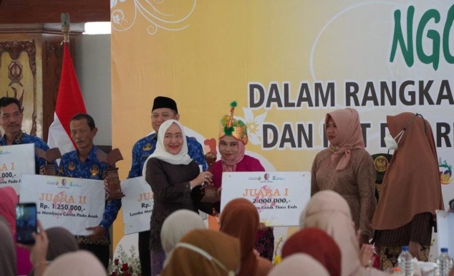 Bupati Bojonegoro Anna Mu'awanah saat penyerahan hadiah Lomba Membaca Buku Cerita Pada Anak dan lomba Ragam Gerak Three Ends.