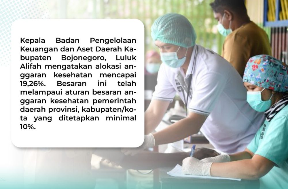 Kepala Badan Pengelolaan Keuangan dan Aset Daerah Kabupaten Bojonegoro, Luluk Alifah mengatakan alokasi anggaran kesehatan ini telah melampaui aturan besaran anggaran kesehatan pemerintah daerah provinsi. Bahwa anggaran kabupaten/kota ditetapkan minimal 10 persen dari APBD.