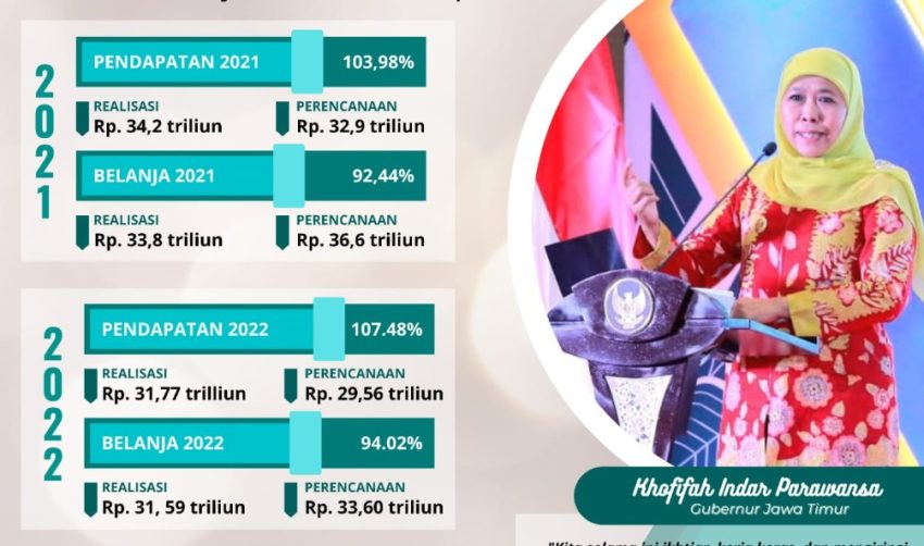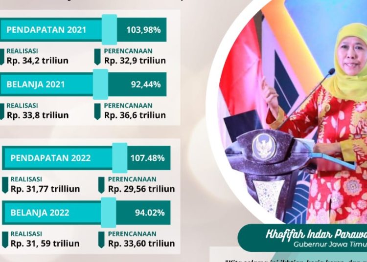 SURABAYATODAY.ID, SURABAYA – Kinerja realisasi pendapatan dan belanja tahun anggaran (TA) 2022 Provinsi Jawa Timur menunjukkan progres yang menggembirakan. Berdasarkan data Laporan Realisasi Anggaran (LRA) per 31 Desember 2022 serta rekonsiliasi 10 Januari 2023 untuk realisasi pendapatan Provinsi Jawa Timur mencapai 107,47 persen atau setara dengan Rp 31,77 trilliun. Realisasi tersebut telah melampaui target yang ditetapkan Rp 29,56 triliun.