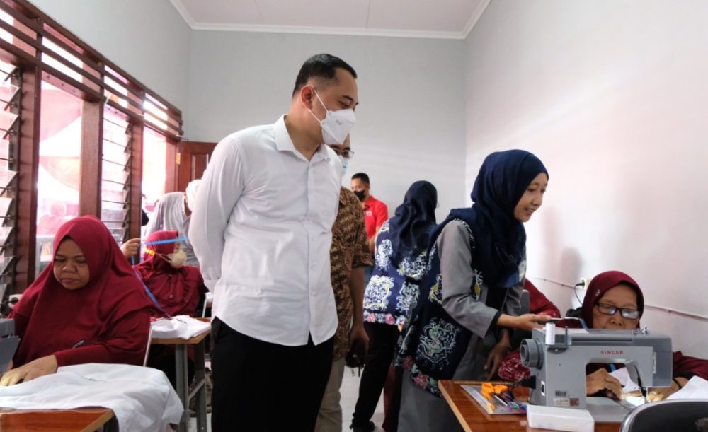 Wali Kota Surabaya Eri Cahyadi meninjau salah satu UMKM yang bergerak di bidang menjahit. Di tahun 2023, pemberdayaan UMKM di APBD Surabaya dialokasikan Rp 3 triliun.