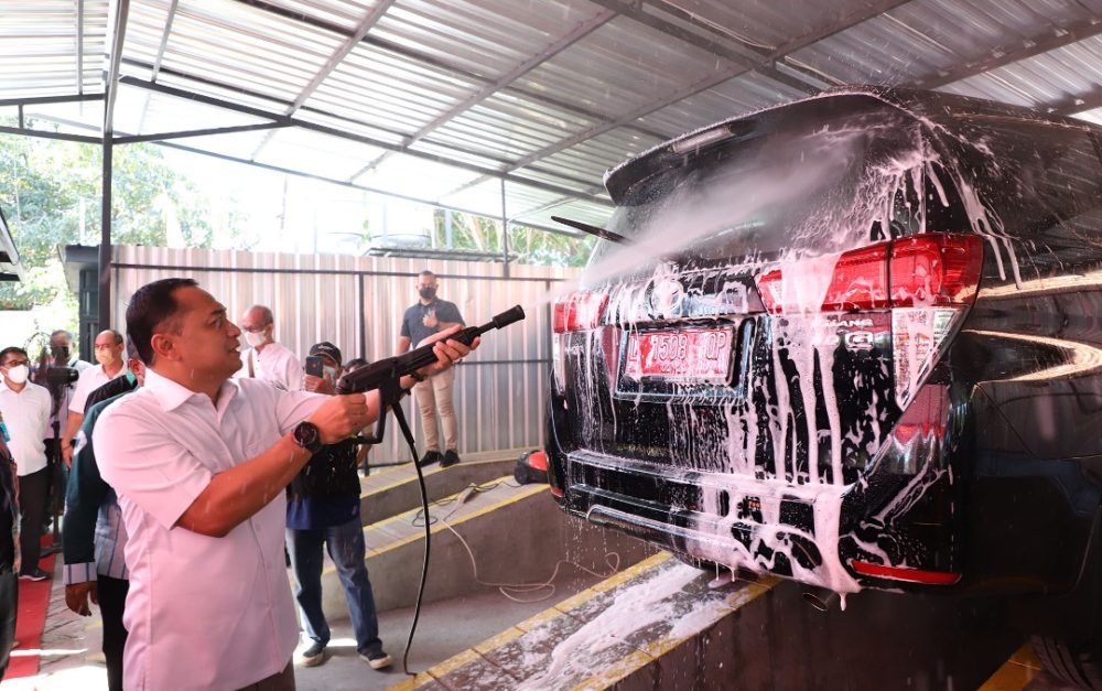 Wali Kota Surabaya Eri Cahyadi mencuci mobil di salah satu lokasi yang menjadi program padat karya.