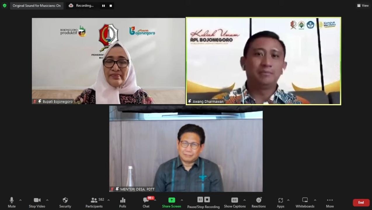 Bupati Bojonegoro Anna Mu'awanah dan dan Menteri Desa Pembangunan Daerah Tertinggal dan Transmigrasi Abdul Halim Iskandar memberi kuliah umum secara virtual kepada mahasiswa RPL Desa, Kabupaten Bojonegoro di Universitas Negeri Surabaya.