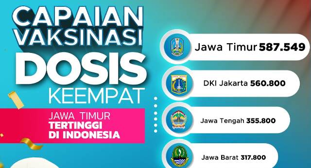 “Alhamdulillah capaian vaksinasi dosis keempat di Jatim tertinggi di Indonesia. Ini menjadi bukti bahwa masyarakat Jatim sangat peduli terhadap kesehatan,” kata Khofifah.