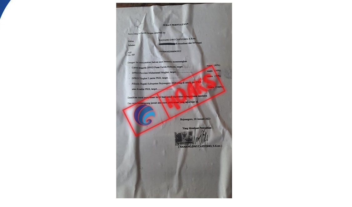 Kabid PIKP Dinas Kominfo Bojonegoro Panji Ariyo Kusumo, memastikan bahwa surat pernyataan yang beredar itu hoax. Ada beberapa yang janggal dalam surat tersebut.