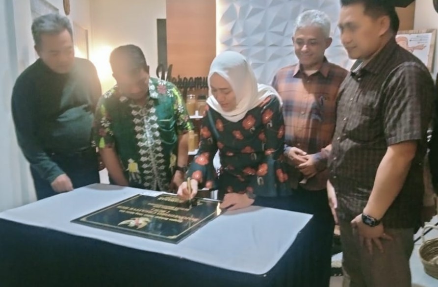 Bupati Bojonegoro Anna Mu"awanah menandatangani prasasti saat meresmikan gedung Bojonegoro Creative Hub.