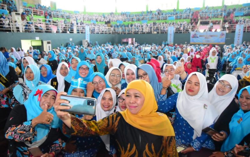 Gubernur Jawa Timur Khofifah Indar Parawansa berswafoto di sela membuka Seminar Nasional  Pendidikan Anak Usia Dini (PAUD) dan menyaksikan pelantikan guru PAUD sebagai agen  penggerak Jatim Bebas Stunting dan PAUD Berkualitas di Gedung Serba Guna GOR Sidoarjo.
