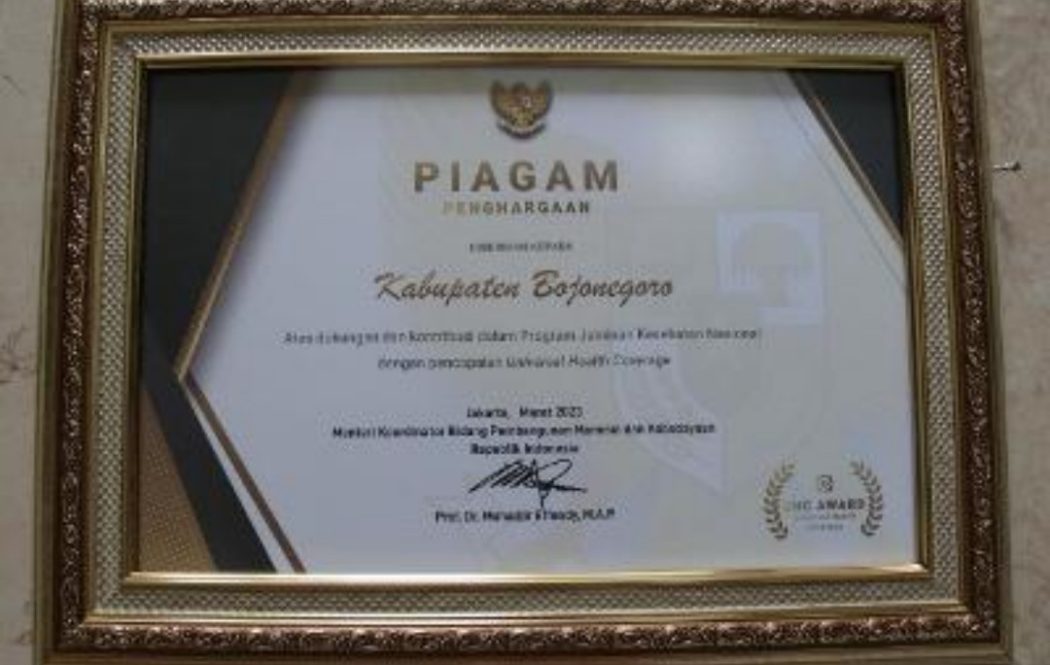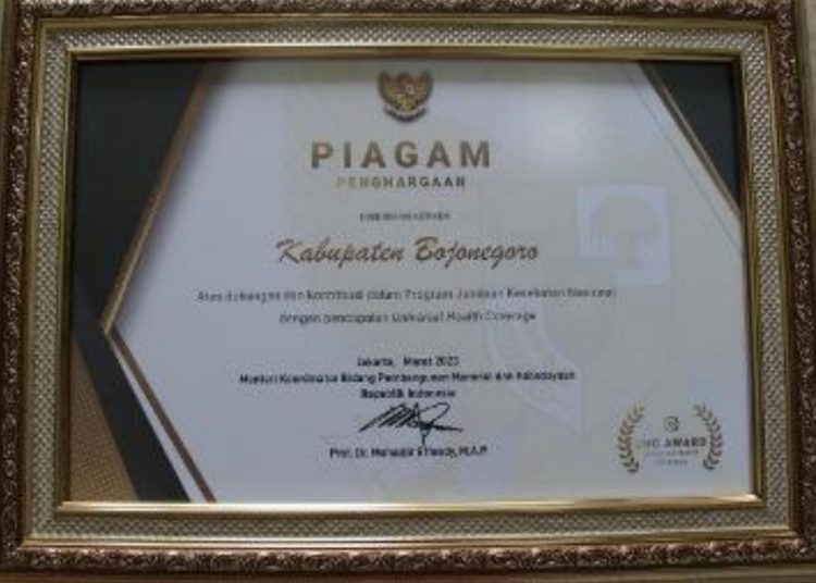 SURABAYATODAY. ID, BOJONEGORO – Pemkab Bojonegoro menerima penghargaan Universal Health Coverage (UHC) atau Jaminan Kesehatan Semesta. Penghargaan ini sebagai wujud nyata komitmen pemerintah daerah dalam mendukung program Jaminan Kesehatan Nasional – Kartu Indonesia Sehat (JKN-KIS) bagi masyarakat.
