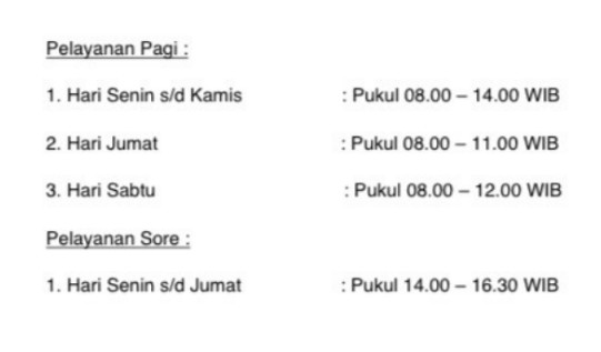 Merujuk hal tersebut, jam pelayanan kesehatan di puskesmas non rawat inap di Surabaya mengalami perubahan. Di antaranya, untuk pelayanan pagi, setiap hari Senin-Kamis adalah pukul 08.00-14.00 WIB. Kemudian pada hari Jumat adalah pukul 08.00-11.00 WIB, selanjutnya pada hari Sabtu adalah pukul 08.00-12.00 WIB. Sedangkan pelayanan sore, setiap hari Senin-Jumat adalah pukul 14.00-16.30 WIB.
