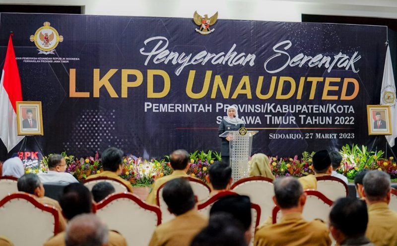 SURABAYATODAY.ID, SIDOARJO – Gubernur Jawa Timur Khofifah Indar Parawansa bersama bupati/wali kota se Jawa Timur menyerahkan Laporan Keuangan Pemerintah Daerah (LKPD) unaudited Tahun Anggaran (TA) 2022 Unaudited ke Badan Pemeriksa Keuangan (BPK) RI Perwakilan Jawa Timur, Senin (27/3).