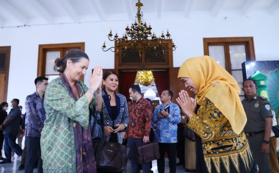 SURABAYATODAY.ID, SURABAYA – Gubernur Jawa Timur Khofifah Indar Parawansa menerima kunjungan Deputy Chief of Mission and Head Economic Affairs Embassy of the Kingdom of the Netherlands H.E. Mrs. Ardi Stoios-Braken di Gedung Negara Grahadi, Surabaya, Selasa (4/4). Dalam pertemuan itu, Gubernur Khofifah membahas sejumlah potensi kerjasama yang dapat dikembangkan di Jatim. Antara lain dalam pengelolaan air, pariwisata, pertanian dan peternakan serta pendidikan dan penilitian.