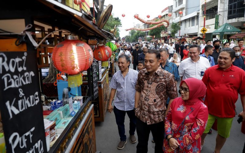 SURABAYATODAY.ID, SURABAYA – Wali Kota Surabaya Eri Cahyadi bersama Sekretaris Daerah (Sekda), dan jajaran Asisten serta Perangkat Daerah (PD) hadir dalam event Ngabuburit di Kya-kya, Rabu (5/4). Eri Cahyadi juga meninjau satu persatu stand UMKM bersama Balai Besar Pengawas Obat dan Makanan (BBPOM) Surabaya.