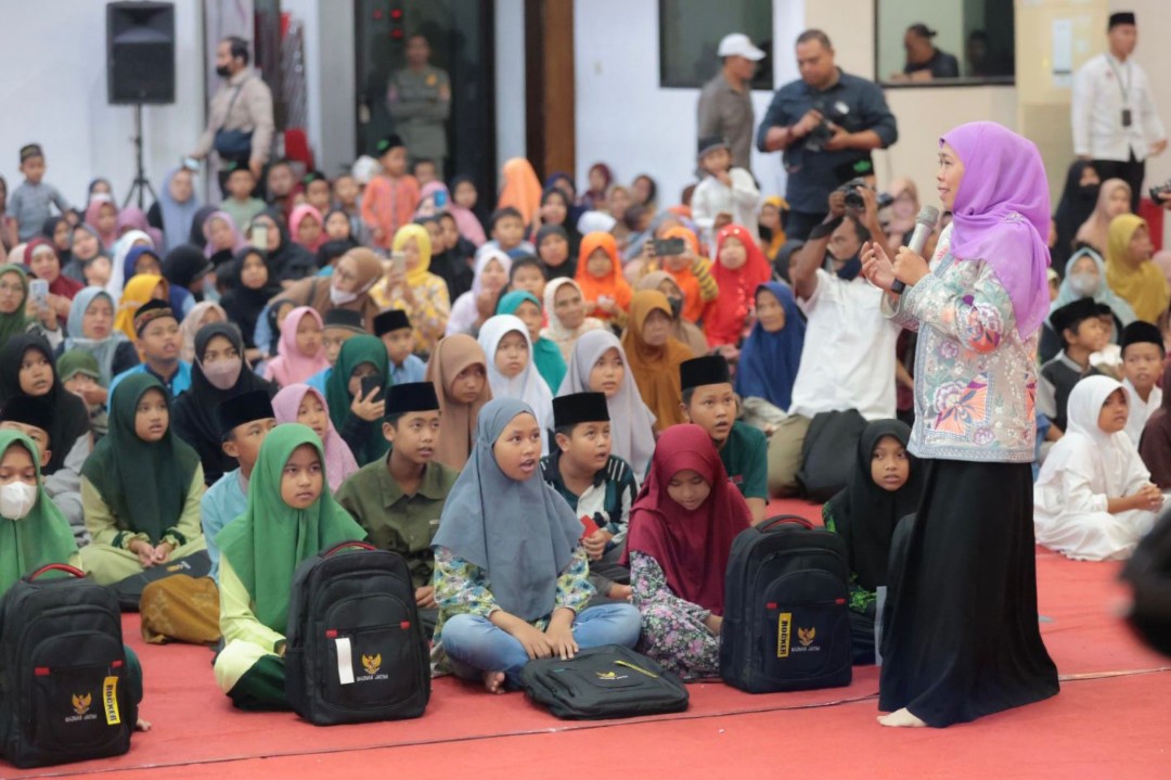 SURABAYATODAY.ID, JEMBER – Usai dari Situbondo, Gubernur Jatim Khofifah Indar Parawansa beserta rombongan kemudian berbagi keceriaan bersama anak yatim/piatu di Kabupaten Jember. Dengan didampingi oleh Bupati Jember Hendy Siswanto dan Wakil Bupati Jember Balya Firjaun Barlaman, Gubernur Khofifah memberikan santunan berupa uang tunai dan paket tas sekolah kepada 700 anak-anak yatim/piatu.