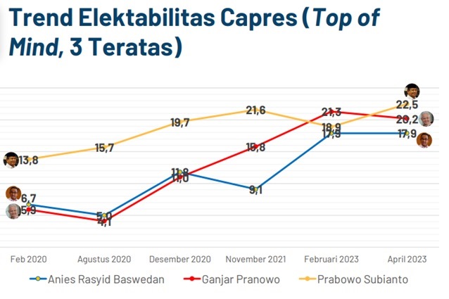 November 2021, elektabilitas Prabowo 21,6 %, Februari 2023 turun sedikit ke 21,3 %. Namun April, elektabilitas Prabowo rebound menjadi 22,5 %, unggul dari Ganjar (20,2%) dan Anies Baswedan (17,9 %).