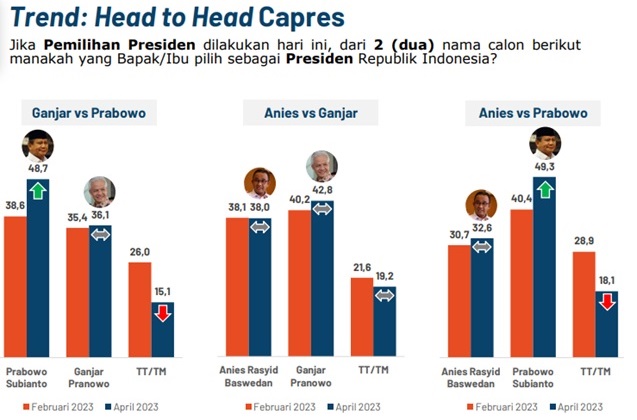 Secara head to head, hasil survei ini juga menunjukkan Prabowo unggul dari Ganjar dan Anies. Anies hanya bisa menang bila melawan Ganjar. Pada April, tren Prabowo head to head dengan Ganjar atau Anies sangat positif dibandingkan Februari. Sebanyak 31,0% responden menganggap Prabowo sebagai suksesor atau figur yang akan melanjutkan pembangunan di era Presiden Joko Widodo.