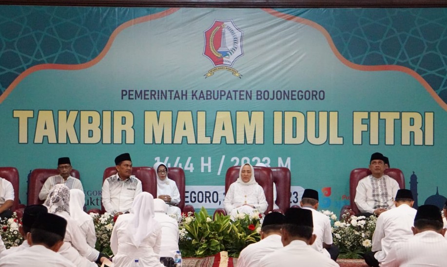 Mengenakan busana muslim serba putih, Bupati Bojonegoro Anna Mu’awanah mengajak kepada seluruh kepala OPD dan camat secara bergantian menggemakan takbir. Nuansa penuh kedamaian pun nampak tercipta ditambah iringan tabuhan bedug.