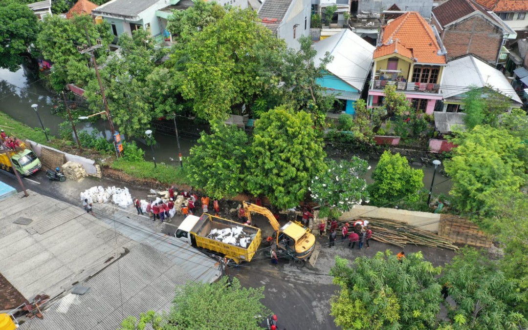 Kepala DSDABM Kota Surabaya Lilik Arijanto mengatakan jebolnya pelapis tanggul tersebut terjadi saat hujan deras mengguyur kawasan Kembang Kuning. Pelapis tanggul yang jebol itu sekitar 20 meter. “Pelapis tanggul itu sudah waktunya rekondisi ya. Di lokasi, kami terjunkan satu unit alat berat dan 40 orang satgas,” kata Lilik.