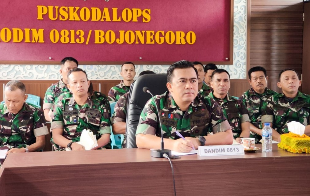 SURABAYATODAY.ID, BOJONEGORO – Didampingi jajaran Perwira Staf, Komandan Kodim 0813 Bojonegoro Letkol Arm Arif Yudo Purwanto, mengikuti pengarahan Panglima TNI Laksamana TNI Yudo Margono melalui Video Conference (Vidcon) di Ruang Pusat Komando Pengendalian dan Operasi (Puskodalops) Makodim 0813 Bojonegoro, Senin (1/5).