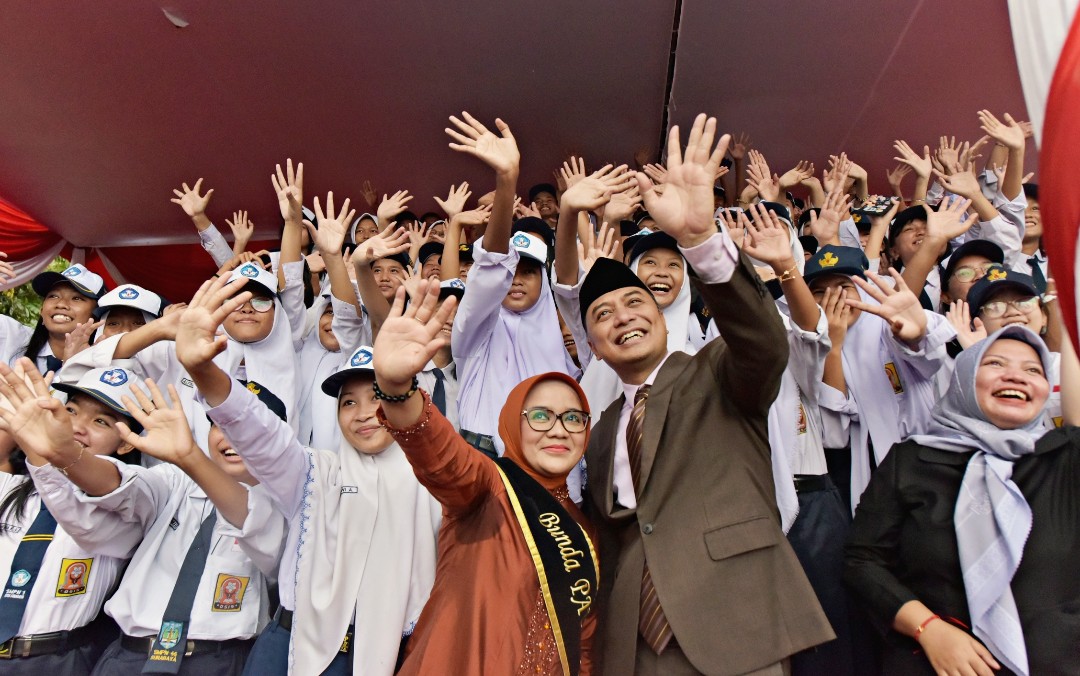 Wali Kota Surabaya Eri Cahyadi beserta istri berfoto dengan para pelajar di sela upacara peringatan Hari Pendidikan Nasional tahun 2023, di halaman Taman Surya.