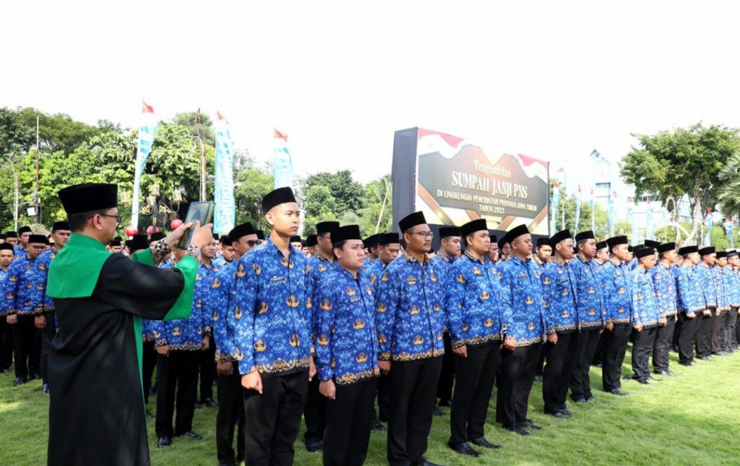 SURABAYATODAY.ID, SURABAYA – Gubernur Jawa Timur Khofifah Indar Parawansa mengambil sumpah dan janji 1.450 PNS lingkungan Pemerintah Provinsi Jawa Timur di Gedung Negara Grahadi, Surabaya, Kamis (4/5) pagi. Mereka yang diambil sumpah terdiri atas 1.300 orang peserta CPNS tenaga kesehatan, tenaga teknis, dan tenaga administrasi tahun lalu. Sedangkan 150 orang lainnya disisir dari para PNS yang belum diambil sumpah tahun lalu.
